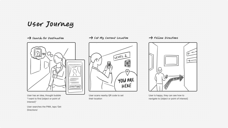 We reframe indoor navigation as a human‑centred design challenge, not simply a technical one. By combining signage, mapping, landmarks and digital cues, Pladia delivers beacon‑free wayfinding that adapts to how people genuinely explore venues, refining insights first uncovered through our early work on location-aware storytelling at MONA.