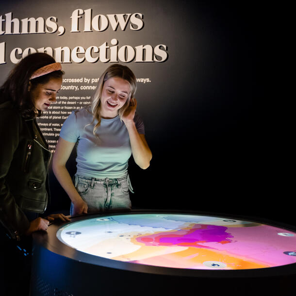Pathways: this touchtable uses an interactive satellite view of how seasonal events, such as temperature, ocean currents, and migration patterns, change over a year. Visitors use their hands to explore how natural elements are linked by intersecting pathways, rhythms and flows that characterise Australia and its seasonality.