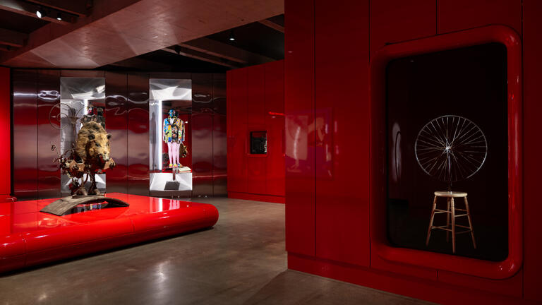 Visitors bid to have their names featured on the gallery walls via interactive LED banners and encounter a garage roller door and pine-lined 'man cave' with an impeccable hotted-up 1977 Holden Torana parked next to a poker table. A red gloss room takes its cue from Mona’s iconic Fat Car, along with monogrammed wallpaper, mirrored surfaces and a stainless steel cube with rubber flooring that riffs on the role of the gym in our quest for status. The exhibition design embraces a daring mix of colour, pattern and texture to create an unapologetically bold aesthetic.